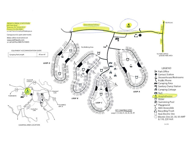 Take 422 East towards Pottstown and make right onto Route 345 South. Stay on Route 345 South for approximately 6 miles and make slight right into French Creek State Park (East Entrance). You will be on Park Road once you enter the park, and make right towards the campground area. Once you enter campgrounds pass through entrance and the Amphitheater will be on your right. Parking is beyond the Amphitheater on right. Please see maps for additional details.